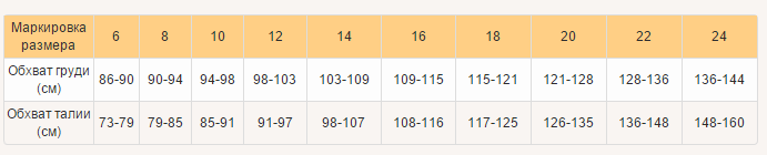 Таблица размеров: