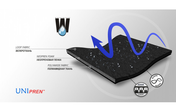 UniPren™ это универсальный трехслойный материал, состоящий из наружного эластичного полиамидного трикотажа с функцией самоприлипания, внутреннего слоя из неопреновой пенки и подкладки изнутри из эластичного трикотажа джерси. Этот материал характеризуется мягкостью и очень высокой эластичностью. Очень важным преимуществом этого материала является то, что он не вязаный, не имеет толстых нитей, поэтому его переплетения не оставляют отпечатка на коже пациента и не вызывают ран в местах сильного сжатия. Функция самоприлипания материала определенно облегчает использование изделия. UniPren™ является водоотпорным материалом.
