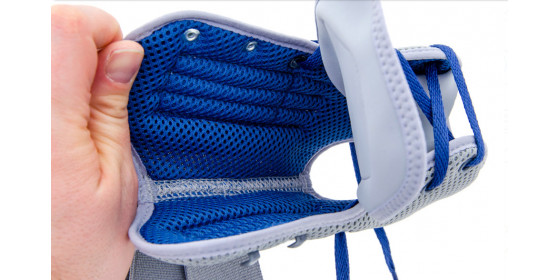 Детский ортез голеностопного сустава изготовлен из современного трикотажа ActiveSpace™. Характеризуется очень хорошей подгонкой к стопе пациента, а так же эффективной стабилизацией, благодаря применению двояко-скрещенных лент, анатомически сформированных вставок и шнуровке. ActiveSpace™ это полиамидный объемный материал 3D, очень легкий, вентилирующий кожу, состоящий из 2 слоев. Между ними находится объемный ажурный материал из полиамида шириной 4 мм. Специфика этого материала в том, что он неэластичен, поэтому хорошо стабилизирует. Внутри между слоями свободно циркулирует воздух. Материал водостойкий.Другим использованным материалом есть ProFit™ — это двухслойный трикотаж, который отлично моделирует тело пациента, растягивается во всех направлениях принимая форму конечности – создаёт т.наз. вторую кожу. Внешний слой из спандекса отвечает за нужную компрессию и прилегание изделия, уменьшает подергивание мышц во время физических усилий. Внутренний слой из микрофибры, хлопка и эластана отвечает за поддержку надлежащего микроклимата и отвод пота, он очень мягкий. Материал приятный для кожи и сертифицирован Oeko-Tex Standard 100. Ортез изготовлен из материалов ProFit и ActiveSpace