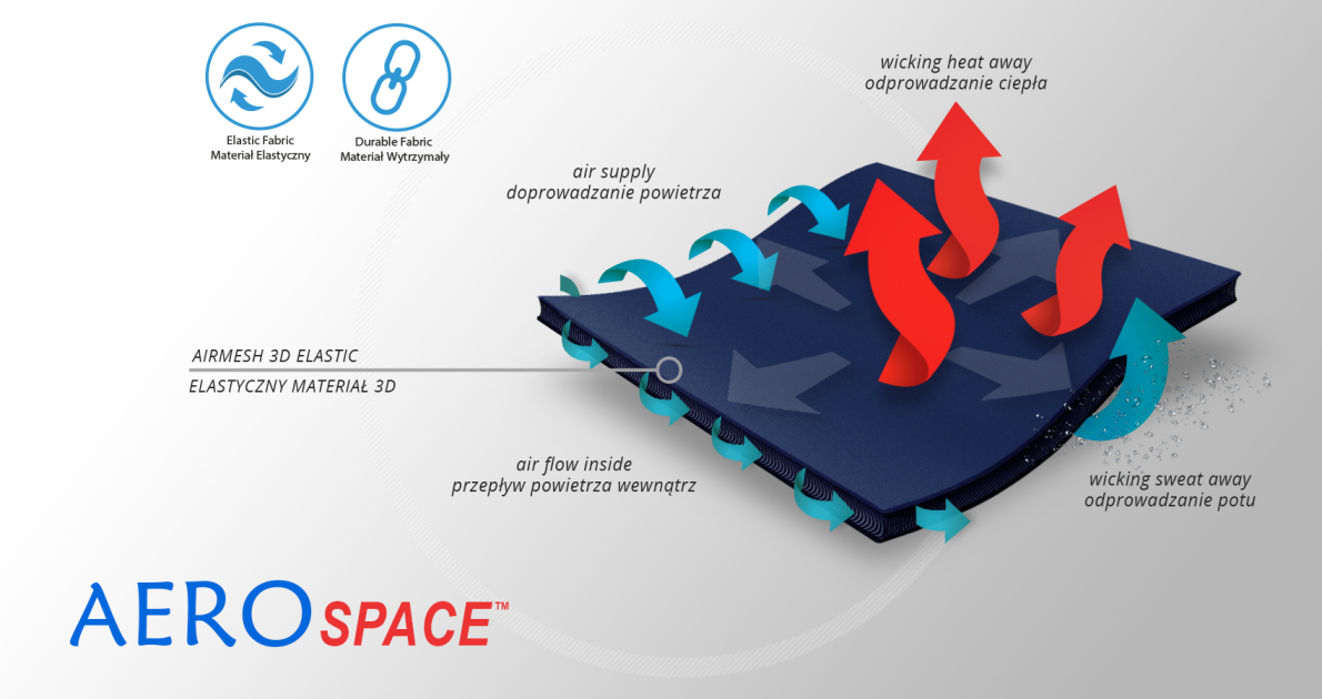 AeroSpace™ это инновационный материал нового поколения. Представляет собой пространный и эластичный 3D материал, состоящий из двух внешних слоев и плетенной внутренней части создающей нужную толщину и разгружающие свойства. Используется полиэстр обеспечивающий механическую прочность и спандекс обеспечивающий эластичность. Это очень легкий, высоко эластичный и ажурный материал, благодаря чему хорошо отводит пот и способствует вентиляции. Изделия из этого материала нейтральны к суставу, не греют и не охлаждают его, но поддерживают нужную компрессию и прилегание и уменьшают дрожь мышц во время физических нагрузок. Его толщина и 3D структура защищают от воздействия установленных на изделии ортопедических шин, фишбин или других жестких элементов и гарантируют мягкость на ощупь.