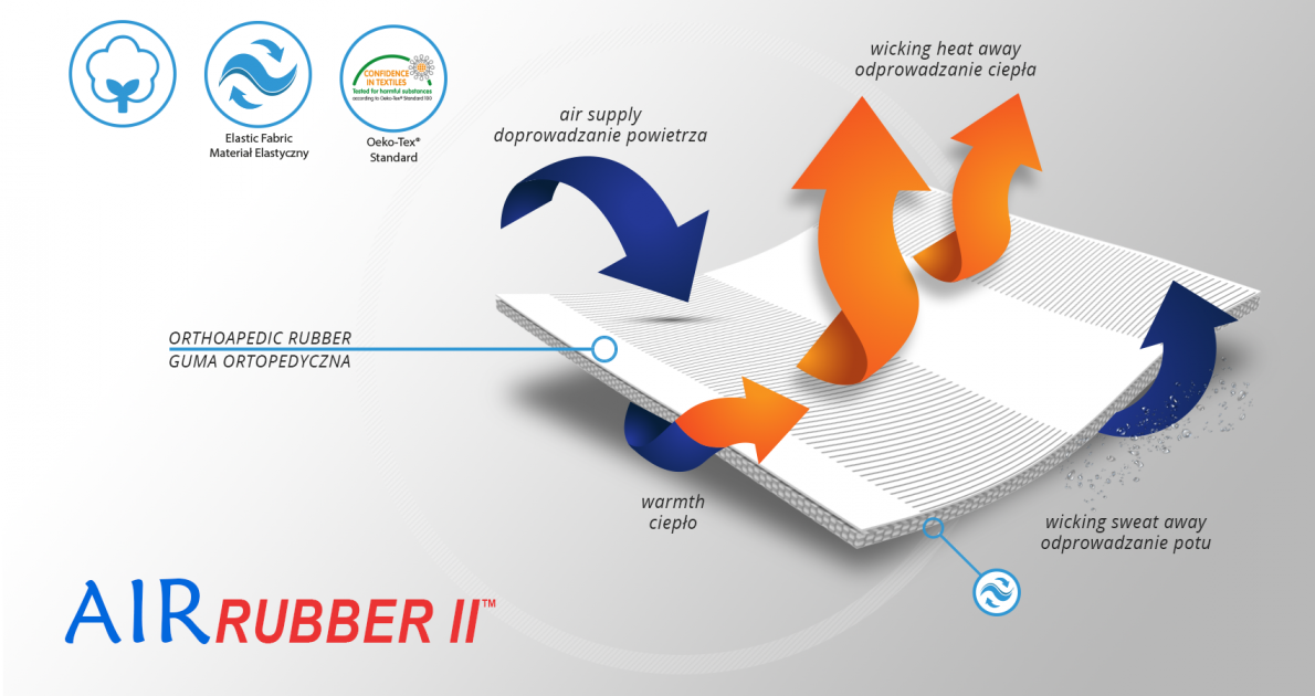 AirRubber II™ очень хорошо пропускает воздух, характеризуется односторонней эластичностью, имеет перформацию. Не растягивается впоперек, что используется для стабилизации. Отверстия между нитями ткани пропускают воздух, что улучшает комфот, позволяет коже «дышать» и лучше отводит пот. Кроме того переплетения нитей резины при более сильной компрессии создают микромассаж кожи. Материал приятный для кожи.