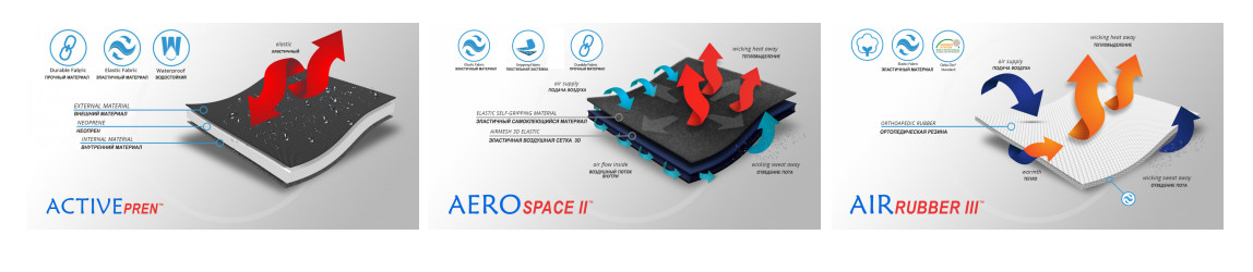 Ремни изготовлены из материала AirRubber III™, который характеризуется односторонней эластичностью. Материал растягивается в длину но не в ширину, что увеличивает компрессию. Воздух свободно циркулирует между нитей, вентилируя кожу. Кроме компрессии материал легко массирует кожу. Материал очень приятный для кожи.