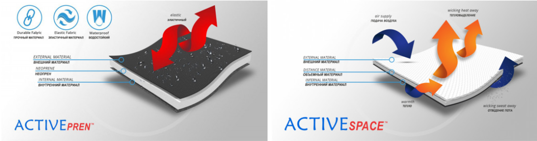 ActiveSpace™ это полиамидный объемный материал 3D, очень легкий, вентилирующий кожу, состоящий из 2 слоев. Специфика этого материала в том, что он неэластичен, поэтому хорошо стабилизирует. Внутри между слоями свободно циркулирует воздух. Материал водостойкий.
