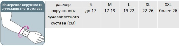Для правильного выбора подходящего размера лучезапястного ортеза Orlett WRS-306 необходимо сантиметровой лентой измерить окружность лучезапястного сустава и воспользоваться таблицей:
