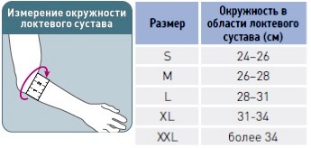 Для правильного выбора подходящего размера локтевого бандажа Orlett MEL-104 необходимо сантиметровой лентой измерить окружность верхней трети предплечья в области локтя. Далее воспользоваться размерной таблицей: