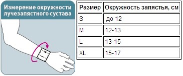 Для правильного подбора детского лучезапястного ортеза Orlett WRS-302 (P) на лучезапястный необходимо измерить сантиметровой лентой (плотно, но не утягивая) окружность лучезапястного сустава. Далее воспользоваться таблицей: