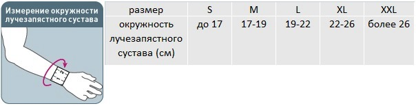 Для правильного выбора подходящего размера лучезапястного ортеза Orlett WRS-308 необходимо сантиметровой лентой измерить окружность лучезапястного сустава и воспользоваться таблицей: