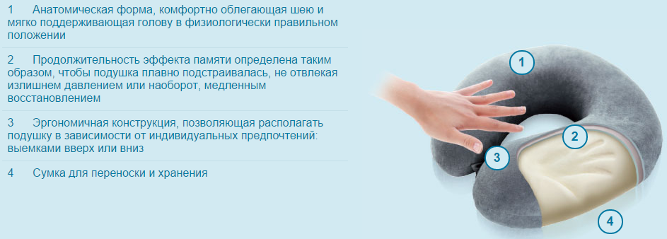Комплектность: Подушка в чехле, съемная наволочка, полиэтиленовый пакет, дорожная сумка, коробка, инструкция по применению